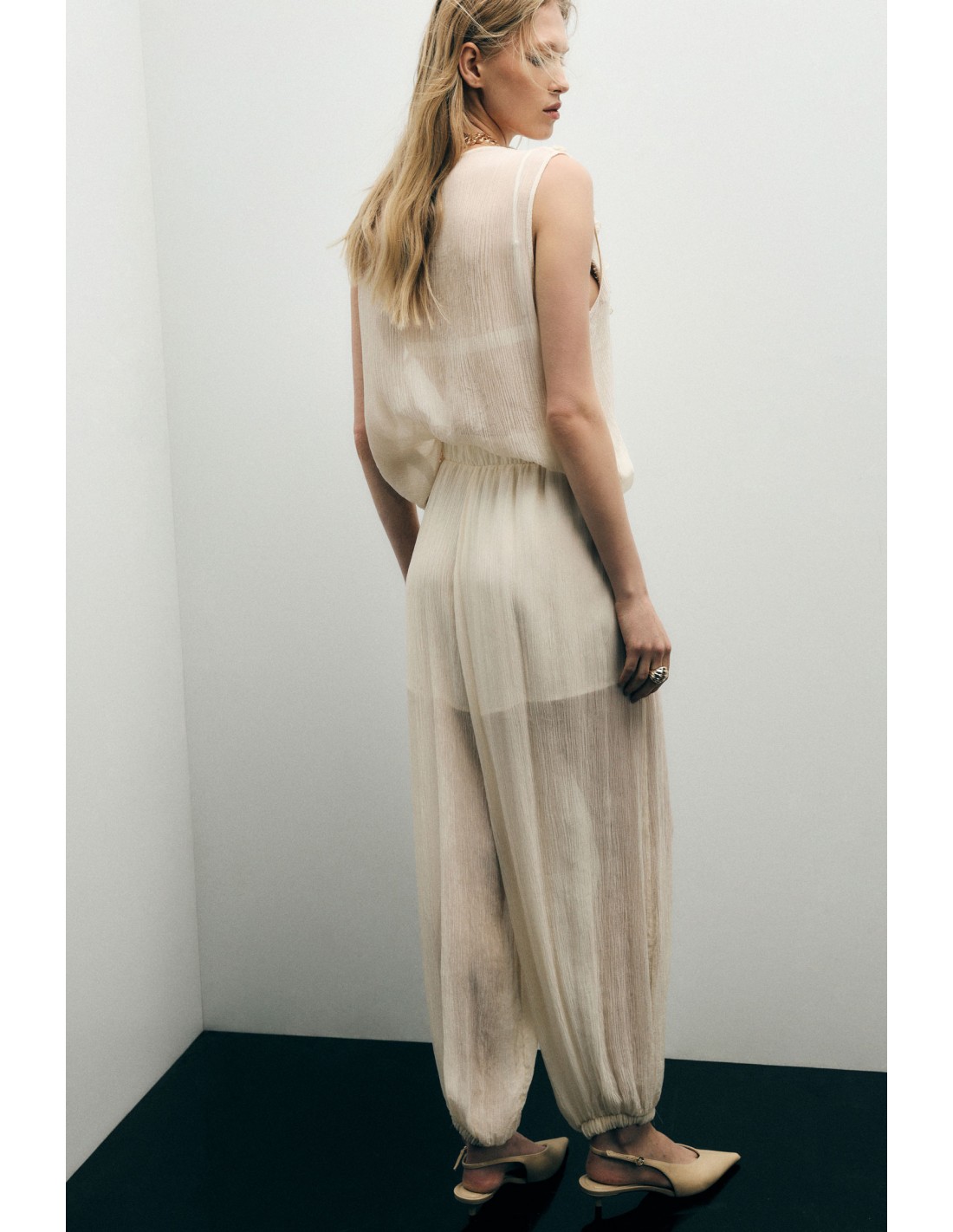 Pantalon balloon athleisure plissé en viscose et cupro, à la coupe ample et structurée. Taille haute élastiquée pour un confort optimal, bas resserrés effet jogging qui équilibrent la silhouette. Matière fluide au toucher doux et légèrement satiné. À porter en ensemble avec les blouses et débardeurs assortis ou en pièce forte avec un blazer. Livraison 24/48h, paiement en plusieurs fois, retours et échanges possibles.