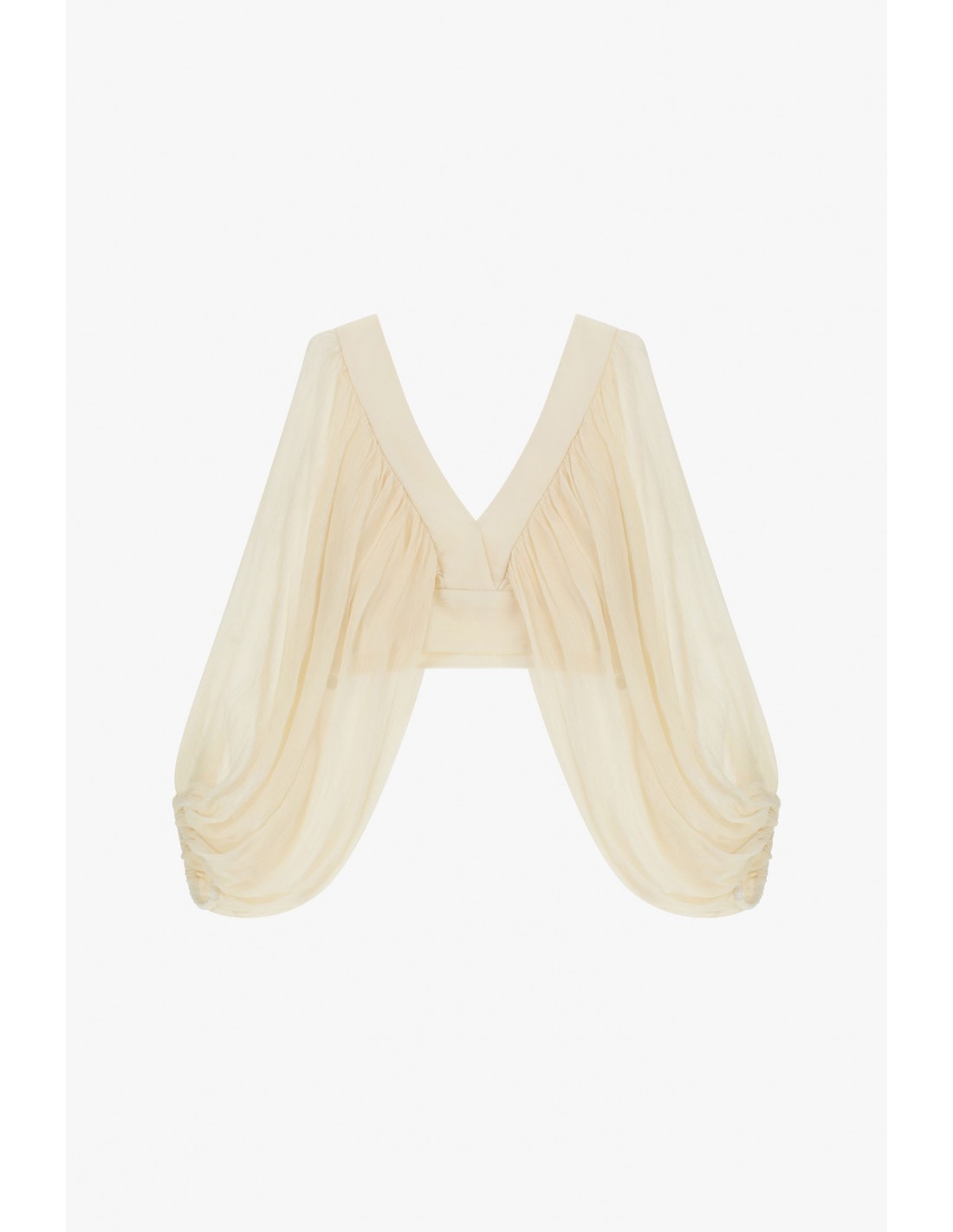 Top court en viscose et cupro à la coupe structurée, avec manches larges transparentes effet drapé et décolleté V profond. Silhouette forte, idéale en look coordonné avec le pantalon assorti ou en pièce statement pour le soir. Livraison 24/48h, paiement en plusieurs fois, retours et échanges possibles.
