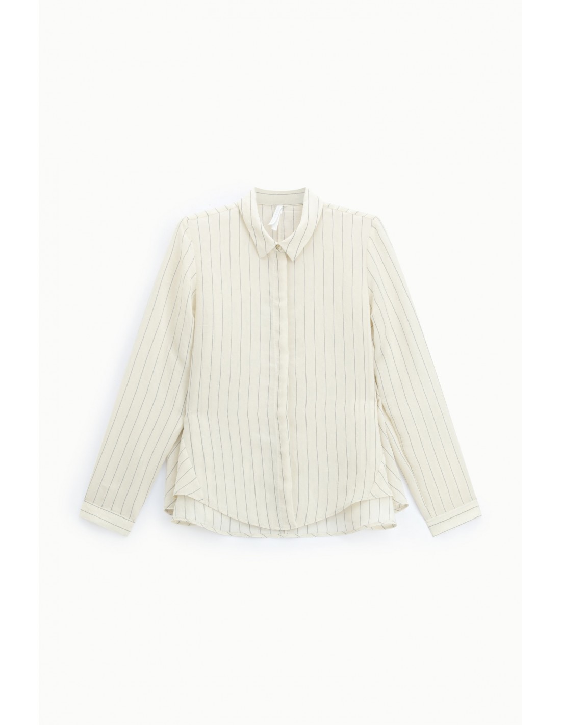 La patte de boutonnage cachée accentue l’aspect épuré du modèle, en supprimant toute rupture visuelle sur le devant. Le col pointe souple adoucit l’ensemble et permet de moduler facilement le style, porté fermé pour une allure plus habillée ou légèrement ouvert pour un rendu plus décontracté.