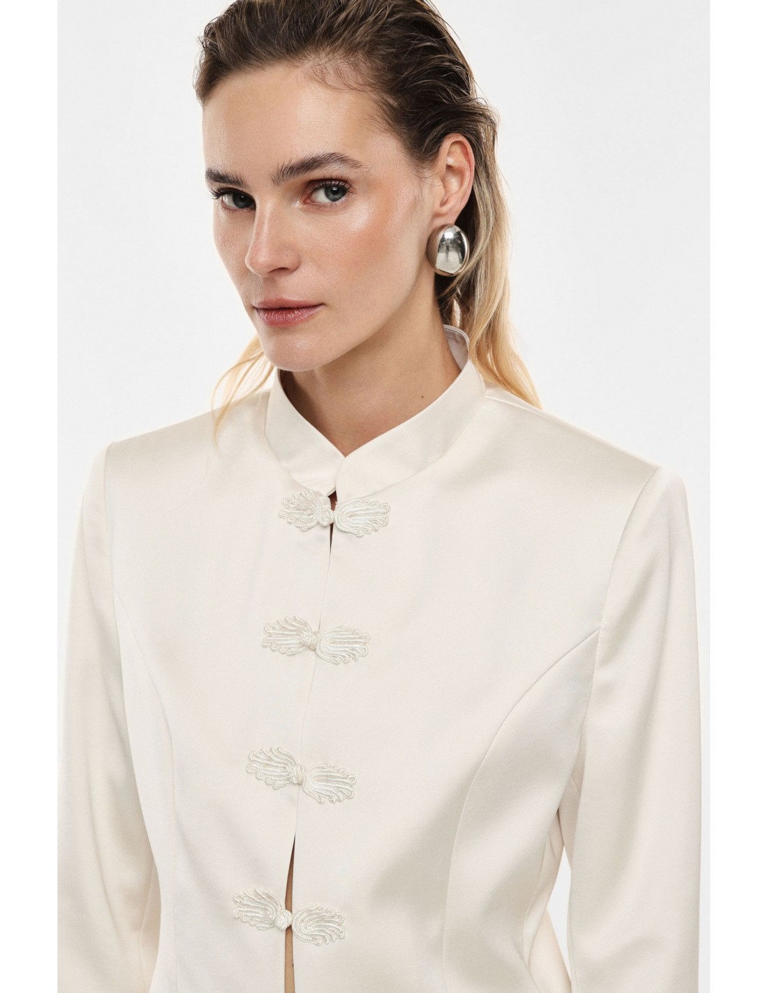 Confectionné dans un crêpe satin fluide et légèrement brillant, il capte subtilement la lumière et renforce son positionnement habillé. Facile à associer, il se porte aussi bien en total look avec le pantalon assorti pour composer un tailleur de cérémonie sophistiqué, qu’en pièce forte sur un jean ou un pantalon plus casual pour casser les codes.