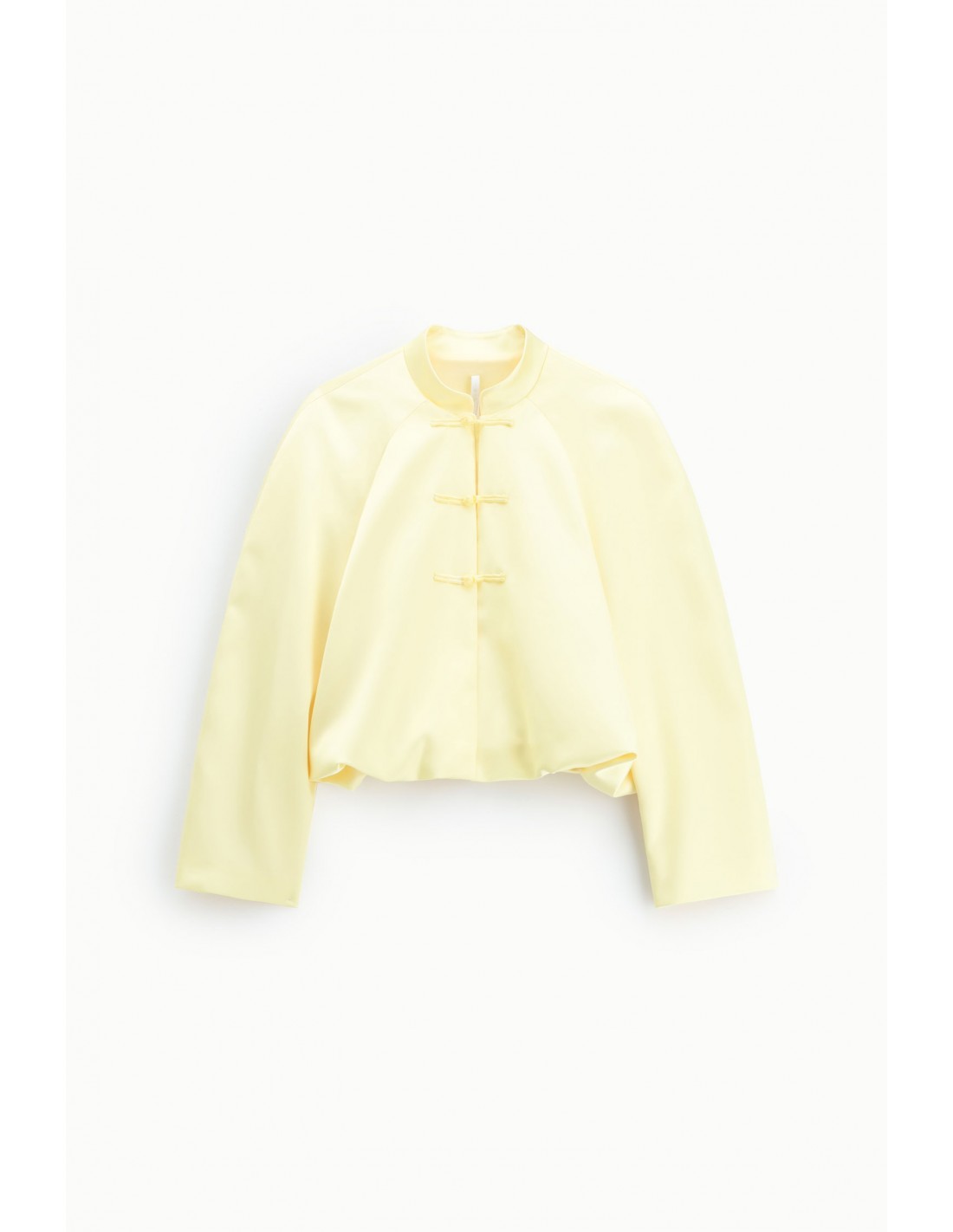 Sa coupe courte et souple, associée à un satin de coton légèrement structuré, crée une silhouette contemporaine facile à intégrer dans un vestiaire habillé ou plus casual chic. Le col mao renforce l’esprit épuré de la pièce tandis que la fermeture japonaise à trois liens ton sur ton apporte immédiatement une signature visuelle forte.