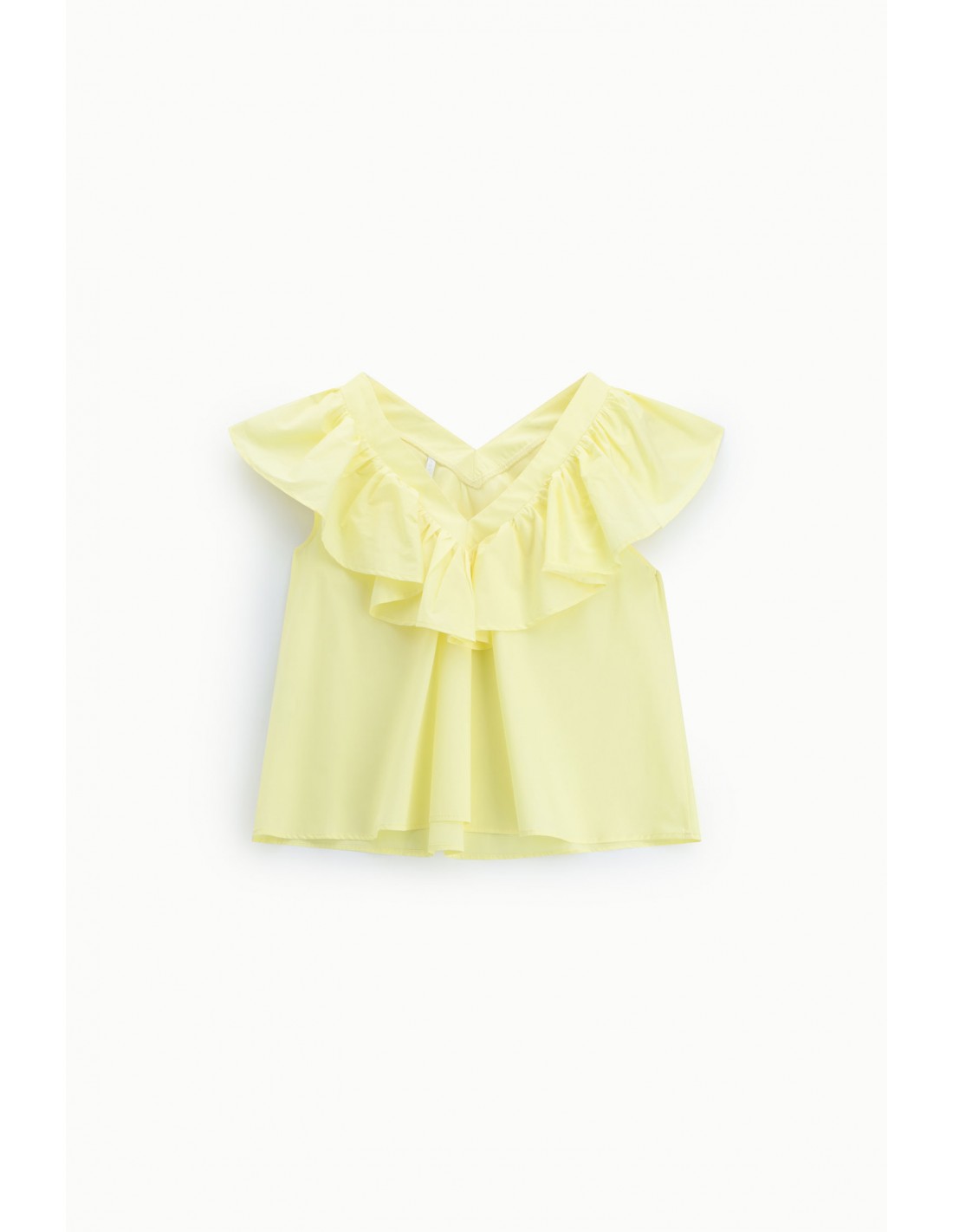 Ce top Imperial Femme en popeline de coton revisite les volumes estivaux avec une silhouette ample et un jeu de volant spectaculaire autour du col.