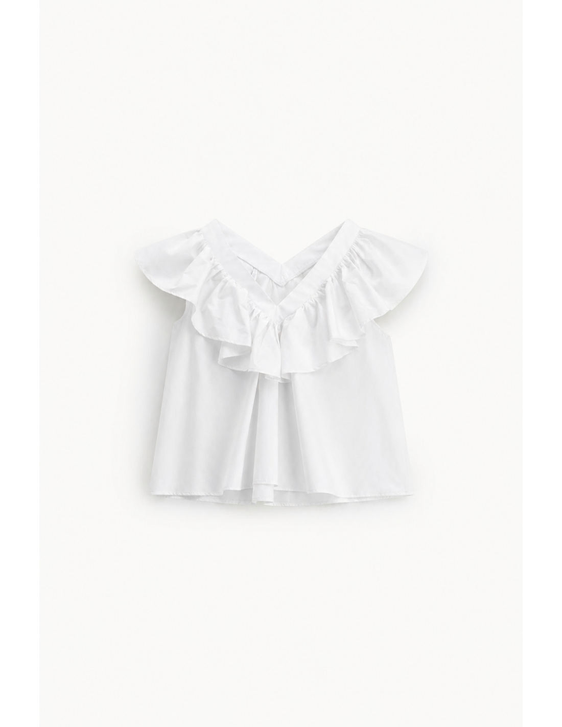 Top Imperial Femme à la silhouette ample, sublimé par un large volant asymétrique structurant le col en V et les épaules.