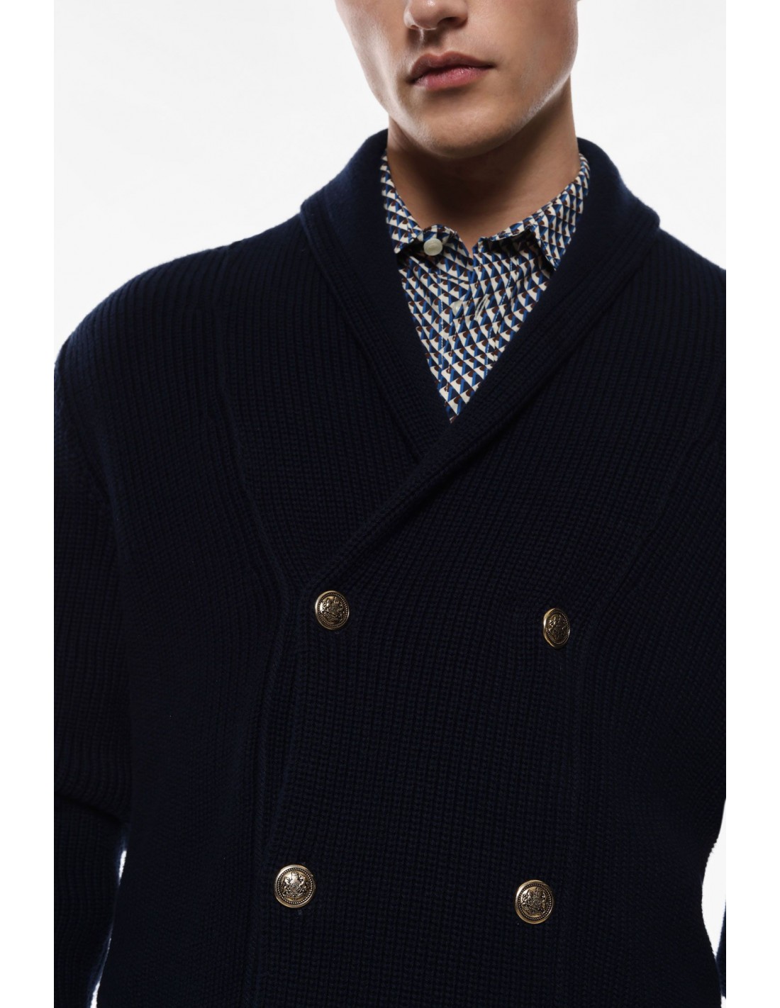 Un essentiel du vestiaire masculin signé Imperial, pensé pour allier confort et élégance. Ce cardigan à manches longues revisite le style marin avec un boutonnage croisé orné de boutons dorés, tout en apportant une touche raffinée grâce à son col châle. Sa maille en côte anglaise 100% coton offre une texture souple et agréable, idéale pour les mi-saisons ou les superpositions hivernales.